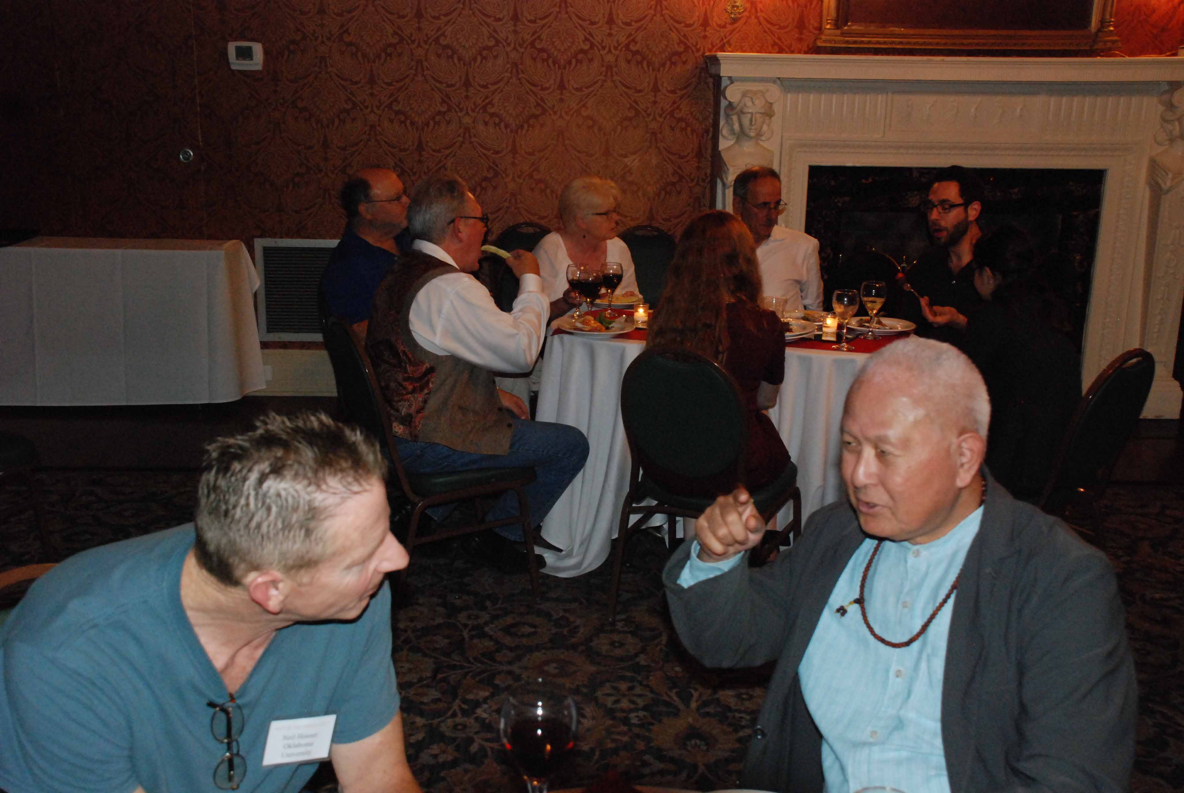 | Roy Tamashiro making a point to Neil Houser at SOPHE reception. |